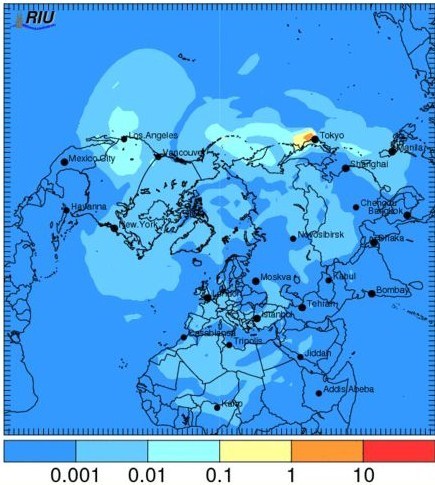 Cette animation affiche une dispersion potentielle du nuage radioactif (isotope césium 137) après l' accident nucléaire à Fukushima I. Le taux de libération continue est très incertain, donc les calculs doivent être interprétés qualitativement. Dispersion dans le niveau près de la surface (niveau 1), dans env. 2500 m de hauteur (niveau 12) et dans env. 5000 m de hauteur (niveau 16).